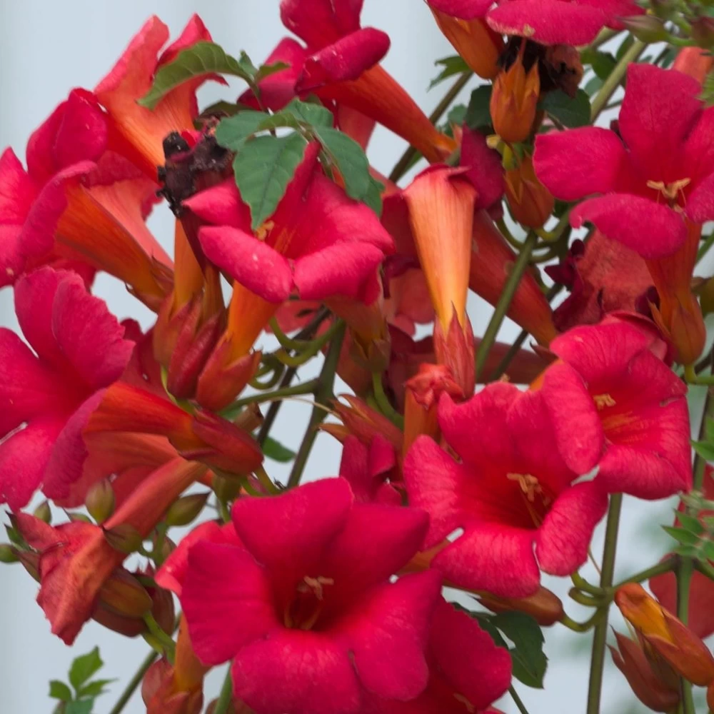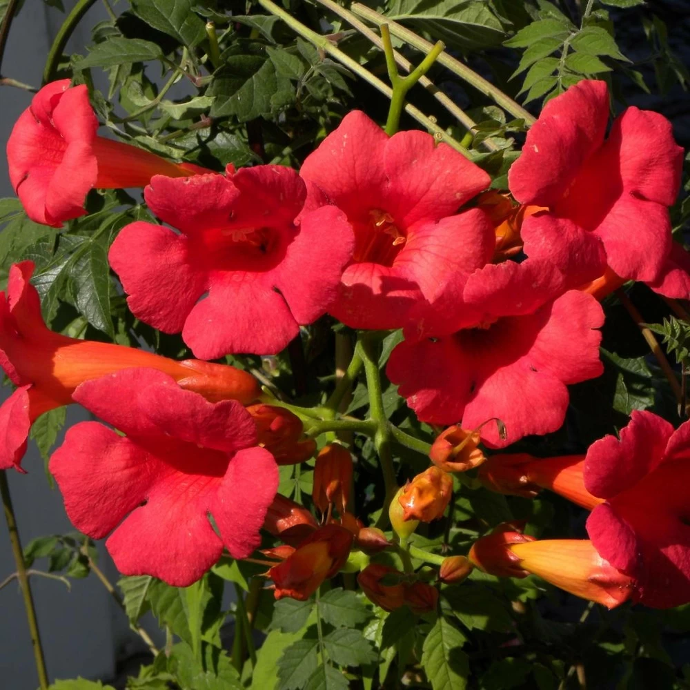 sa floraison est abondante et précoce. Les trompettes d’un rouge très lumineux s’épanouissent abondamment dès le mois de juin, et se renouvellent ensuite jusqu’en septembre.