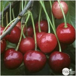 Cette variété est très vigoureuse, à port érigé, et très fertile, elle s’adapte facilement à tous les porte-greffes. Sa mise à fruits est rapide. La floraison à la fin du mois de mars, est tout simplement exceptionnelle. Une abondance de petites fleurs blanches orne l’arbre et lui donne cet aspect remarquable. Le fruit est un bigarreau, récolté en début du mois de juillet. Très gros, de couleur rouge brillant très foncé, il est porté par un petit pédoncule et possède un tout petit noyau. Sa chair est ferme, croquante, sucrée et acidulée. Cette variété un peu sujette à l’éclatement, est pollinisée par ‘Burlat’, ‘Reverchon’, ou ‘Early River’. Attention, elle est incompatible avec ‘Napoléon’.