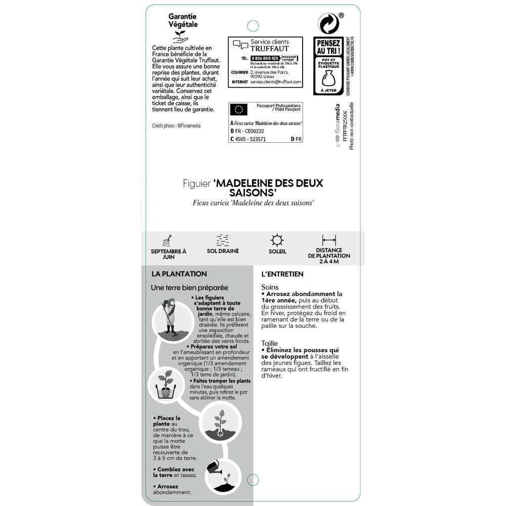 Le genre Ficus (Figuier) comprend environ 800 espèces, originaires d’Amérique, d’Afrique et d’Asie tropicale. Ficus carica (Figuier cultivé) est l’espèce la plus connue, cultivée au Proche-Orient dès la fin du IVe millénaire avant J.-C. ‘Madeleine des 2 saisons’ est une variété horticole.Arbre à port arrondi, érigé. Bifère*, cette variété donne des figues-fleurs fin juin, début juillet. Les seconds fruits sont mûrs en septembre-octobre. Les fruits sont jaune doré, de forme piriforme pour les fruits d’été, plus arrondie pour les figues d’automne. La chair est rose, juteuse.