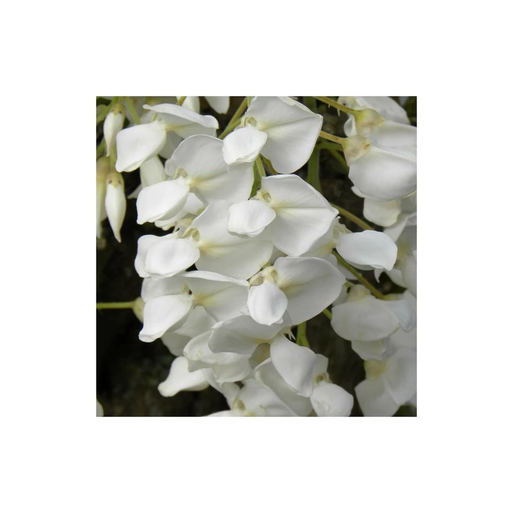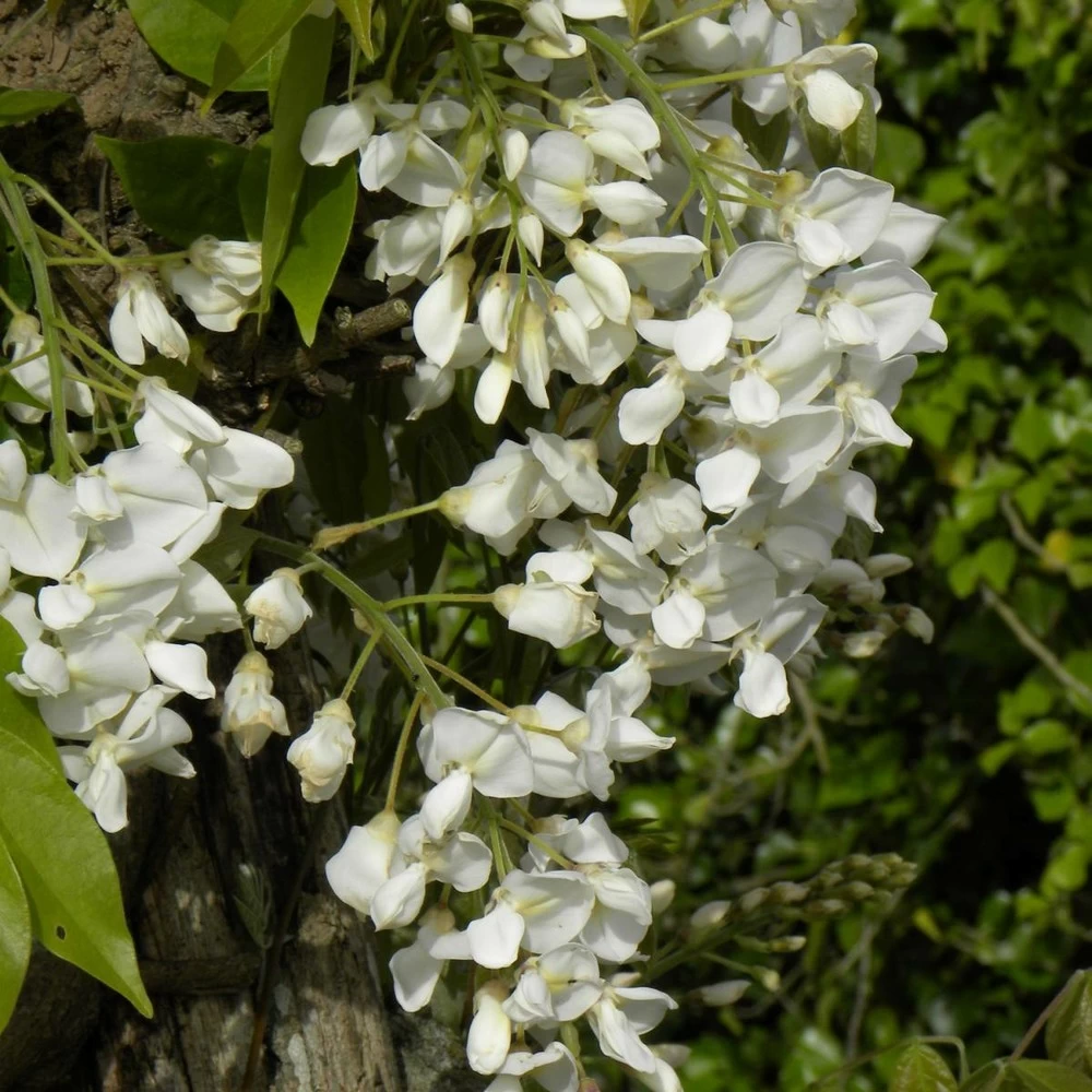 la glycine venusta est plus communément appelée glycine soyeuse ou glycine gracieuse. Le nom venusta lui vient de l’italien « venusto » qui signifient gracieux, jolie, mignonne, charmant. Sa floraison blanche est spectaculaire de par ses très nombreuses grappes qui apparaissent toutes en même temps. Ses feuilles d’apparence soyeuse et vert clair se développent en même temps que les fleurs. Son parfum est assez soutenu.
