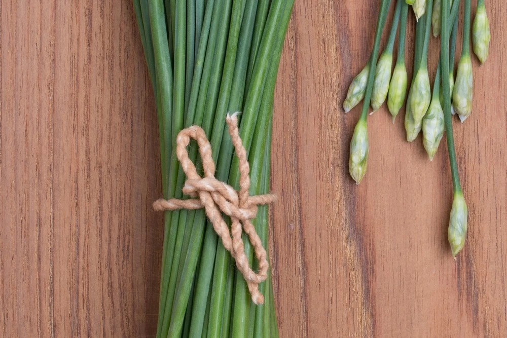 l’apparence extérieure de la ciboulette de chine rappelle la ciboulette, mais ces fleurs d’environ 30 cm de long sont de 1,5 à 8 cm plus larges. Par contre, le goût et l’arôme de la ciboulette de chine ressemblent à ceux de l’ail, mais elle est considérablement plus douce et ne dégage pas l’odeur d’ail. Les feuilles à croissance touffue et les fleurs ou bourgeons blancs peuvent être récoltés de juin à octobre, lorsque les bourgeons encore fermés sont au plus croquant et ont un goût particulièrement délicat. Il est conseillé de ne jamais récolter toute la plante et de ne pas trop couper les feuilles au-dessus du sol, afin de ne pas endommager les nouvelles pousses. La ciboulette de chine fraîche raffine les sandwichs au fromage, les tartes flambées, les oeufs brouillés, les tomates, les salades et le quark. Si elle est brièvement blanchie, elle devient une addition excellente aux plats asiatiques. Comme la plupart des herbes, vous devez ajouter la ciboulette de chine seulement à la fin de la cuisson pour que les arômes puissent se déployer au mieux. Les fleurs sont aussi comestibles et ont une note agréablement douce. Elles sont plutôt décoratives et sont utilisées pour les desserts sucrés et les plateaux de fruits. Vous pouvez utiliser les bourgeons pour les plats frits, les ragoûts et les soupes, les smoothies, les salades et les plats froids.