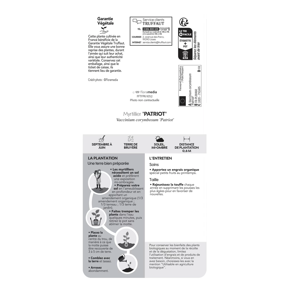 Arbuste buissonnant, vigoureux et à port presque érigé. Compact et rustique, il offre un magnifique feuillage orange vif à l’automne. ‘Patriot’ ne craint pas trop les maladies telles que le phytophtora. La floraison est précoce, elle a lieu début mai. Mais cette variété est résistante au froid, et offre même un rendement régulier et élevé. La fructification a lieu entre fin juin et fin juillet. Etalée, elle donne des grappes de myrtilles bleu foncé, à très grosses baies, fermes, au goût rustique. La récolte est facilitée par le port de l’arbuste.