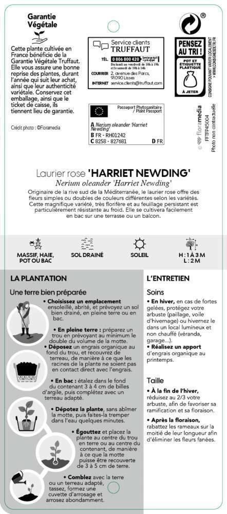 Nerium Oleander est un grand arbuste qui fleurit généreusement de mai à octobre. Les fleurs tubulaires à 5 pétales soudées sont groupées en cimes terminales au bout des rameaux. Il existe plus d’une centaine de variétés de Laurier rose, à fleurs simples ou doubles, parfois parfumées. Les couleurs de floraison peuvent être blanche, jaune, saumonée, rose, rouge, mauve. Le feuillage persistant est d’un vert légèrement gris, plus clair sur le dessous. Les feuilles simples sont opposées ou verticillées par 3. Elles sont lancéolées de 10 à 15 cm de long et pratiquement sessiles, directement attachées sur les rameaux. L’arbuste est ramifié dés la base, ce qui crée une touffe dressée assez dense de 2 à 4, 5 mètres de haut pouvant être utilisée aussi bien en haie libre qu’en plante isolée en bac. Laurier-rose ‘Harriet Newding’ (Nerium blanc trigré) offre une fleur simple, blanc crème, rayé d’un fin trait rouge en son centre de chaque pétale.