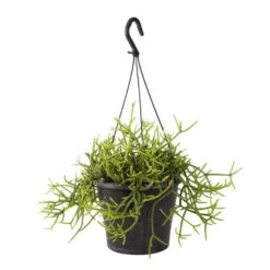 Le genre Rhipsalis comporte environ 50 espèces, originaires des régions tropicales et sub-tropicales. Cactée épiphyte au port dense, arrondi, retombant, remarquable par ses longues et très fines tiges cylindriques, vertes, de 30 cm de long. Fleurs blanches en hiver. Cette plante est facile d’entretien à condition de la placer en situation éclairée, mais pas en plein soleil et de lui assurer une température supérieure à 12°C. L’arrosage doit être modéré, une fois par semaine, en laissant sécher la surface du substrat entre deux arrosages. Diminuer les arrosages en hiver. Bassinez le feuillage deux fois par semaine en été. Faire des apports d’engrais une fois par mois de juillet à septembre. Elle se plait bien entre 18°C et 20°C toute l’année