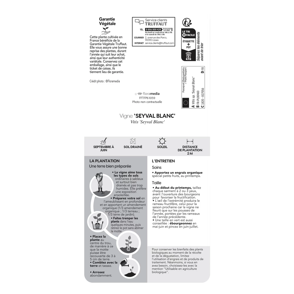 Le vitis est un genre de plante, d’arbuste, arbrisseaux ou plantes sarmenteuses de la famille des vitaceae. Ce genre comprend environ 70 espèces plus communément appelées vignes. La vigne ‘Seyval Blanc’, originaire de St Vallier dans la drôme, est une variété sucrée, aromatique et bien juteuse. La vigne produit des grappes moyennes à chair pulpeuse. Principalement utilisée pour la production de vent, les fruits arrivent à maturité en septembre.